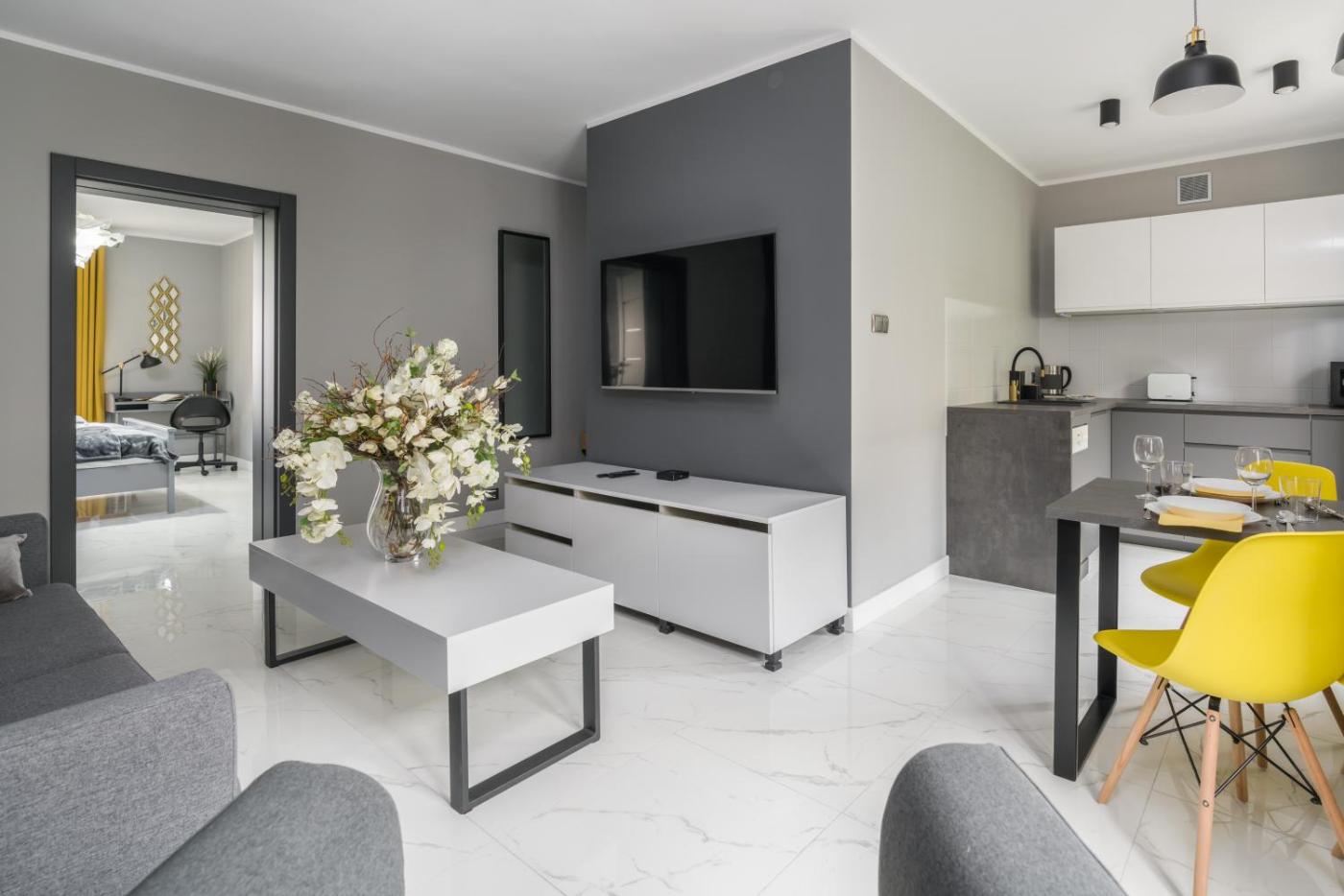 Oferta apartamentu obejmuje sypialnię (1), salon, aneks kuchenny z pełnym wyposażeniem, w tym lodówką i czajnikiem, a także łazienkę (1) z prysznicem oraz bezpłatnym zestawem kosmetyków. W apartamencie zapewniono ręczniki i pościel.